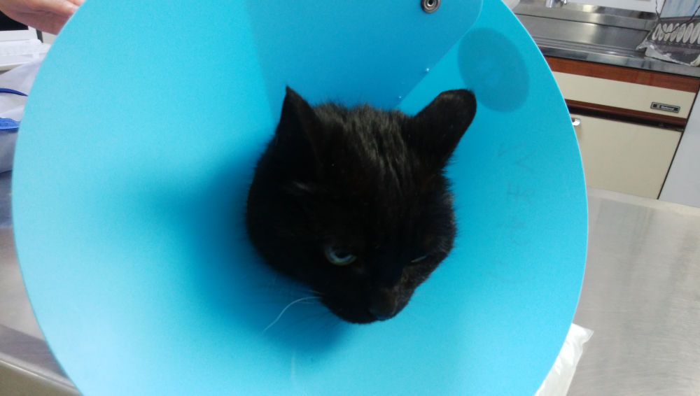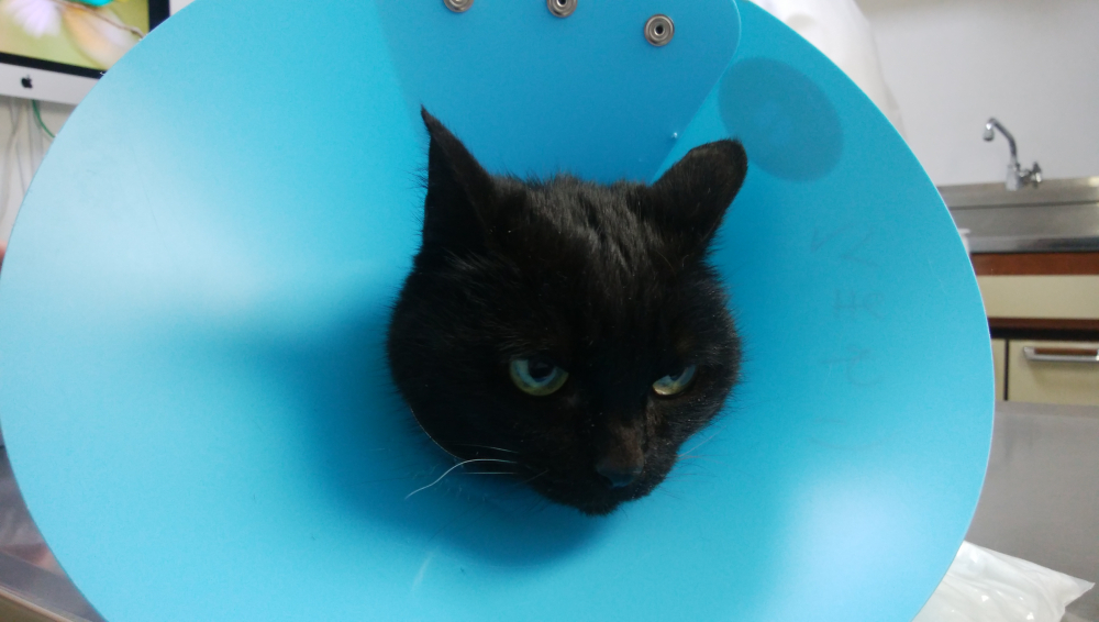 エリザベスカラーを付けられるクロ。