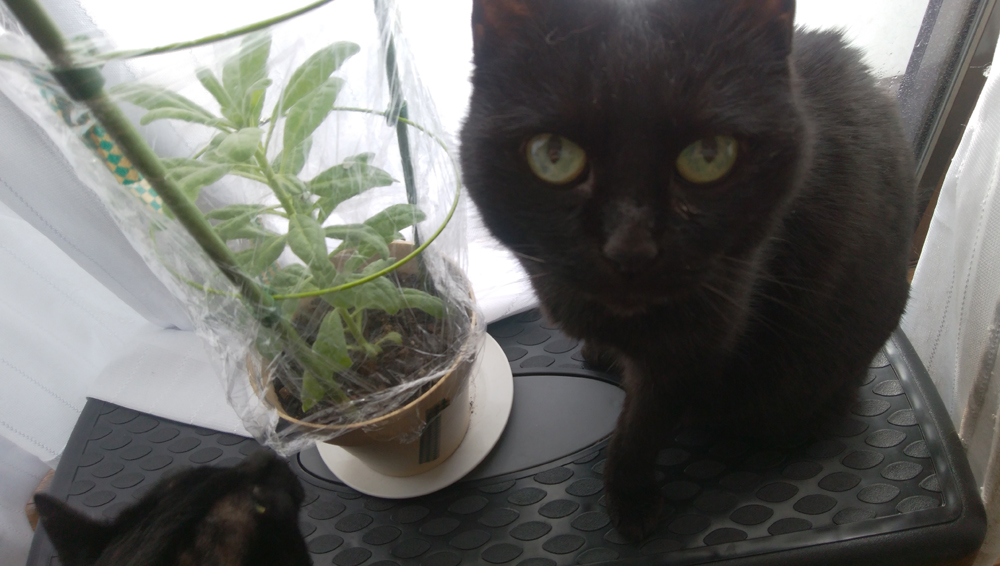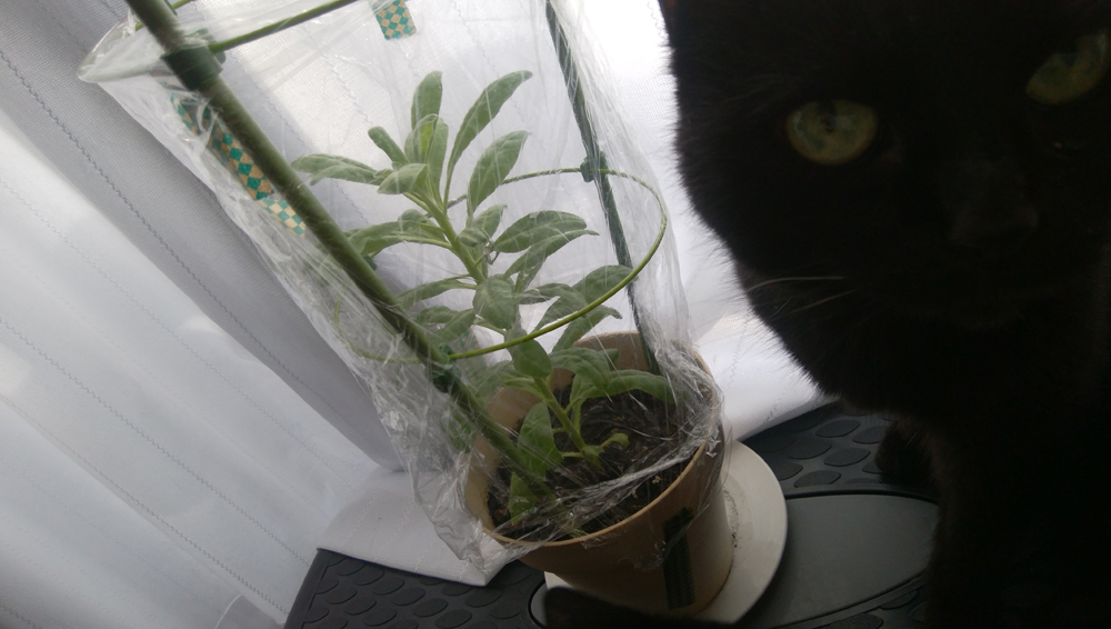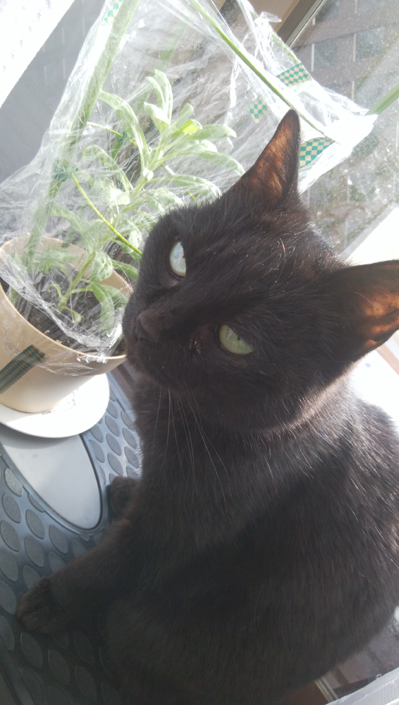 日光浴中のクロと育ってきたストック。